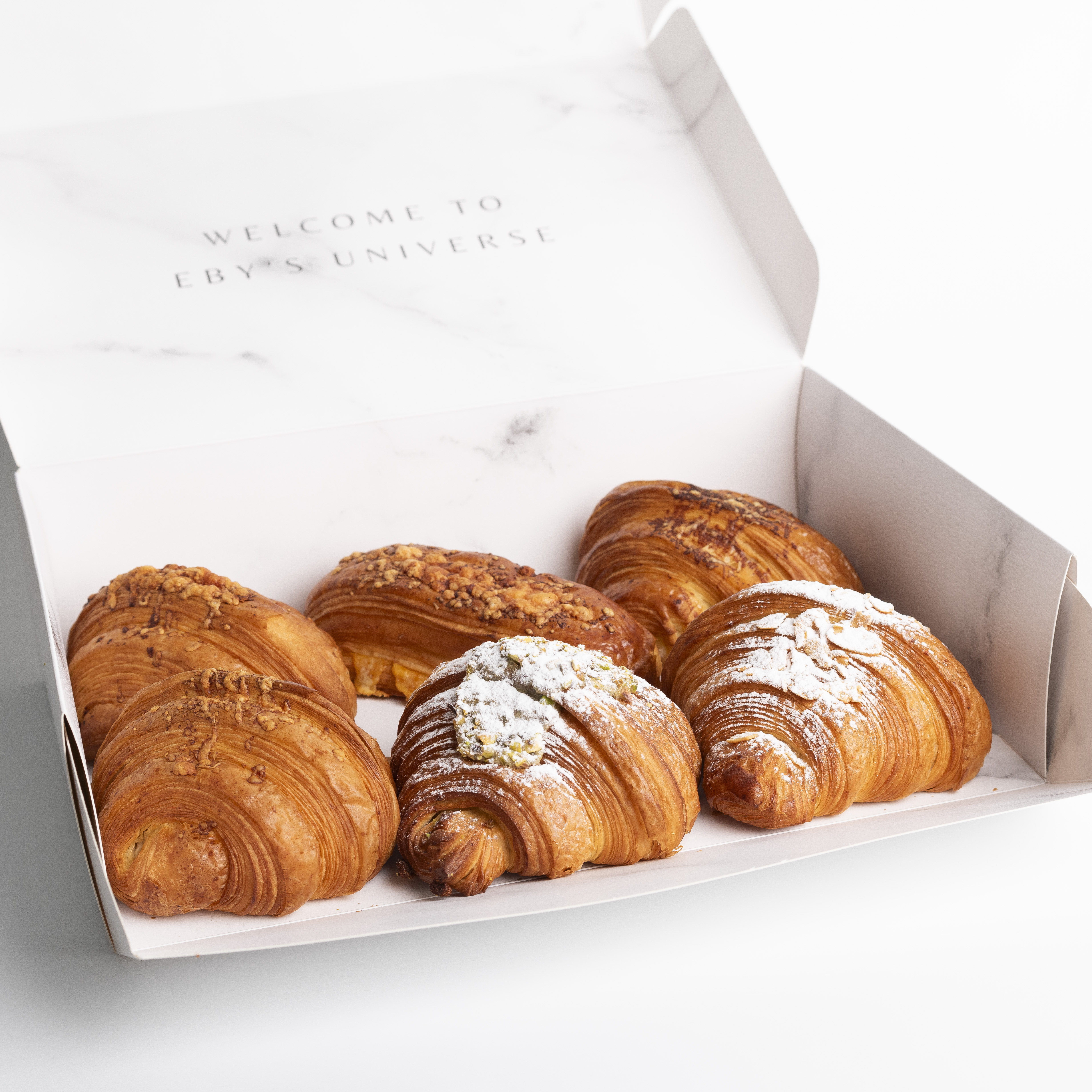 Indulge with our exclusive new additions of stuffed viennoiserie box containing one of each: Emmental Croissant, Cream Cheese & Basterma Croissant, Basterma & Roumi Cheese Croissant, Smoked Beef & Cheddar Suisse, Almond Marzipan Croissant, Pistachio Marzipan Croissant.